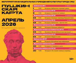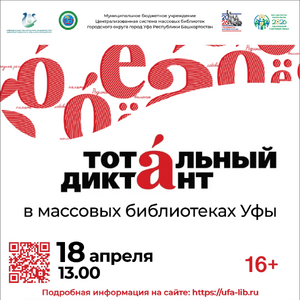 С 22 по 25 апреля 2026 года - Международный День памяти о Чернобыльской катастрофе в массовых библиотеках Уфы С 15 апреля по 12 мая 2026 года - Акция #МЫВМЕСТЕ в массовых библиотеках Уфы 18 апреля 2026 года 18:00 часов - «Библионочь‑2026» в Уфе: единство народов, творчество и семейные ценности 18 апреля 2026 года в 13:00 часов - Тотальный диктант-2026 в массовых библиотеках Уфы 23 апреля 2026 года в 11:30 часов - Интеллектуальная игра «Разложи по полочкам» С 03 марта по 23 апреля 2026 года с 09:00 до 20:00 часов - Выставка «Поэзия повседневности»