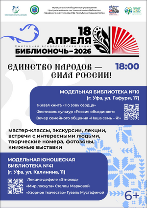 Приглашаем жителей и гостей Уфы присоединиться к Всероссийской акции «Библионочь‑2026», которая пройдёт под девизом «Единство народов — сила России!». Это событие посвящено Году единства народов России и Году большой и дружной семьи в Республике Башкортостан. Вас ждёт вечер, наполненный духом культурного многообразия, семейными традициями и теплом живого общения.