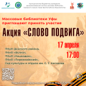 Массовые библиотеки Уфы приглашают вас принять участие в акции «Слово подвига», приуроченной к 80-летию Великой Победы и Году защитника Отечества в России. Это событие объединит литературу и патриотизм. В рамках акции участники смогут погрузиться в атмосферу военных лет через стихи известных поэтов: Александра Твардовского, Ольги Берггольц, Константина Симонова и других.