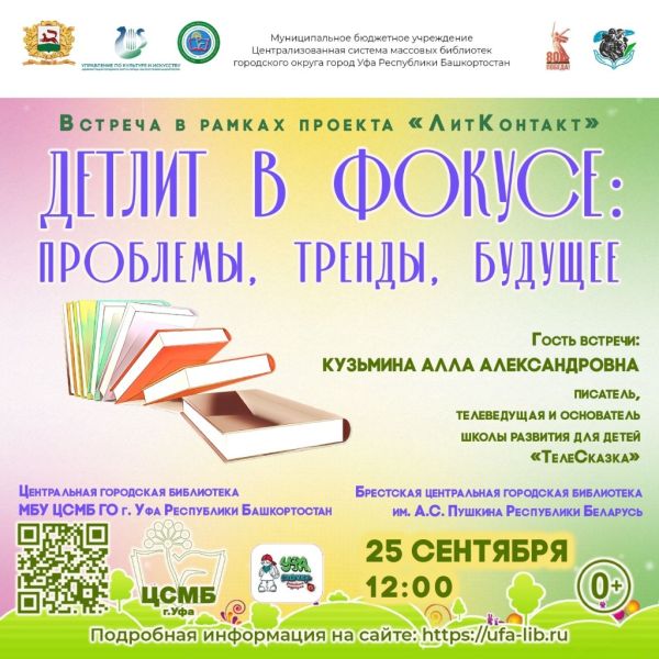 25 сентября в 12:00 часов Центральная городская библиотека МБУ ЦСМБ ГО г. Уфа РБ проведёт вторую онлайн–встречу в рамках проекта «ЛитКонтакт» с Брестской центральной городской библиотекой им. А.С. Пушкина Республики Беларусь.