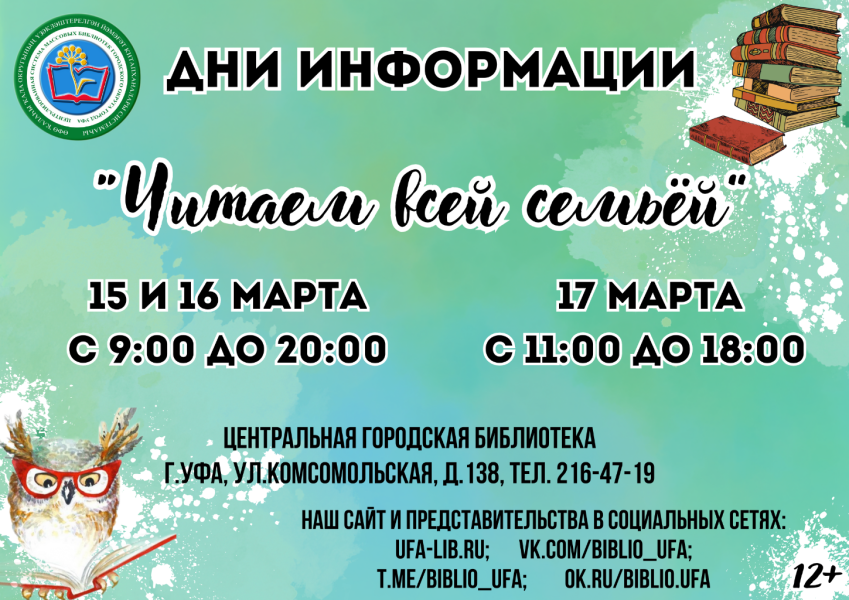 15, 16 и 17 марта 2024 года Центральная городская библиотека Уфы приглашает жителей города на дни информации «Читаем всей семьёй».