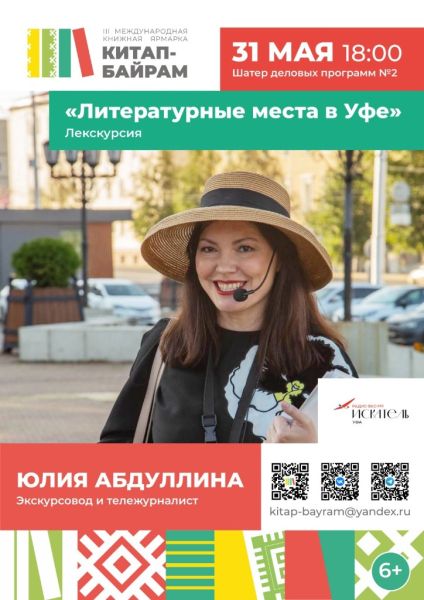В рамках III Международной книжной ярмарки "Китап-Байрам" радио "Искатель" Уфа 89.0 FM приглашает на Лекскурсию экскурсовода и тележурналиста Юлии Абдуллиной «Литературные места в Уфе» 31 мая с 18.00 до 19.00!