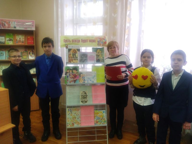 Прозвучали поэтические произведения и песни о самом дорогом на свете человеке - маме. Школьники стали активными участниками викторины «Моя мама самая». Ознакомились с литературой, представленной на книжной выставке «Пусть всегда будет мама» в читальном зале библиотеки.