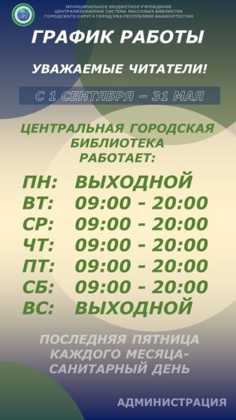 Доводим до вашего сведения, что с 1 сентября Центральная городская библиотека г. Уфы переходит на зимний режим работы.