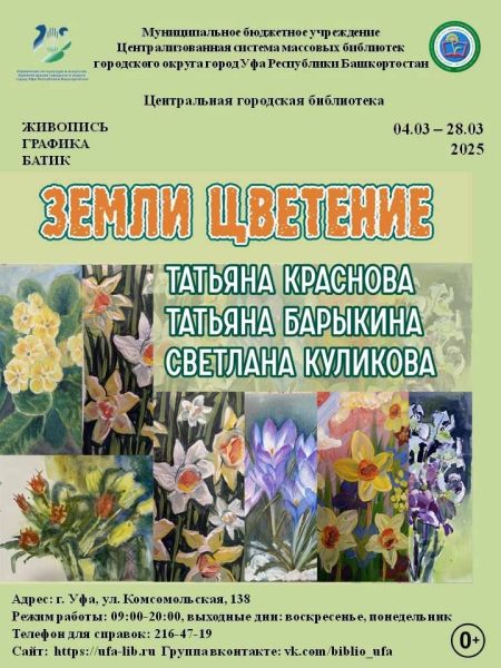 В Центральной городской библиотеке города Уфы открылась художественная выставка «Земли цветение». В экспозицию вошли камерные цветочные композиции Татьяны Барыкиной, Татьяны Красновой и Светланы Куликовой. Работы написаны в разные годы. Некоторые - во время пленэра, другие - в мастерской. Но все они наполнены восторгом от прекрасного творения природы - цветов. Для художниц важно было передать и цвет, и линию, и даже аромат цветущих растений. Розы, ирисы, хризантемы, пионы, те, что растут в наших садах или украшаю парки нашей климатической зоны. Они дарят радость людям и художницы хотели запечатлеть эту красоту, остановить мгновение.