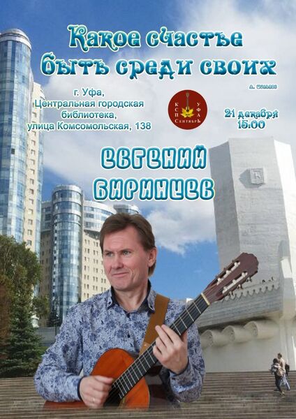21 декабря 15.00 в Центральной городской библиотеке выступит Евгений Биринцев с программой «Какое счастье быть среди своих», в которой прозвучат лучшие песни, полюбившиеся российскому зрителю.