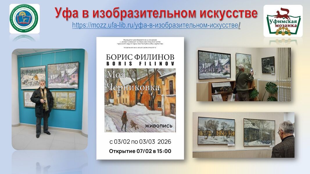О сохранении памяти о родном городе говорит и уфимский художник Борис Филинов, выставка которого «Моя Черниковка» работает с 3 февраля в модельной юношеской библиотеке № 41. «…Тема, какую я вкладывал в свои работы, должна сохранить хотя бы небольшую часть уходящей эпохи и ухватить ее лирическую ауру…» - говорит художник о своих произведениях.