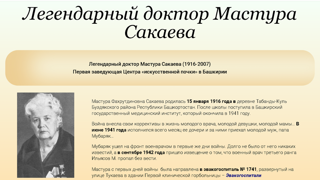В январе 2026 года исполнилось 110 лет легендарному доктору, создателю Центра «искусственной почки» в Башкирии, Заслуженному врачу БАССР, Герою Социалистического Труда Мастуре Фахрутдиновне Сакаевой.