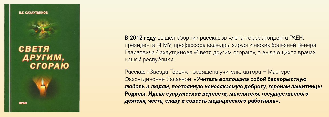 В 2012 году вышел сборник рассказов члена-корреспондента РАЕН, президента БГМУ, профессора кафедры хирургических болезней Венера Газизовича Сахаутдинова «Светя другим, сгораю», о выдающихся врачах нашей республики.