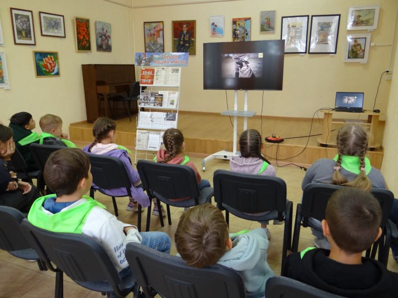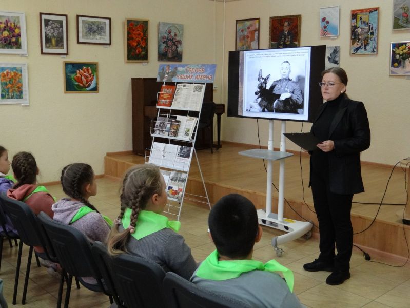 Ведущая мероприятия, заведующая залом отраслевой литературы и периодических изданий Наталья Калачева рассказала ребятам, какие задачи приходилось выполнять друзьям человека: собаки выполняли роль подрывников танков, связистов, разведчиков, санитаров; голуби выполняли роль почтальонов с важнейшими донесениями; лошади использовались как тягловая сила.