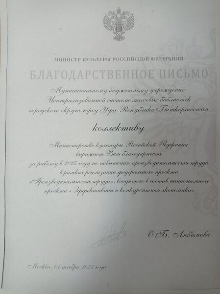 Благодарственное письмо за подписью министра культуры России Ольги Любимовой получил директор системы массовых библиотек Уфы Роберт Загидуллин.