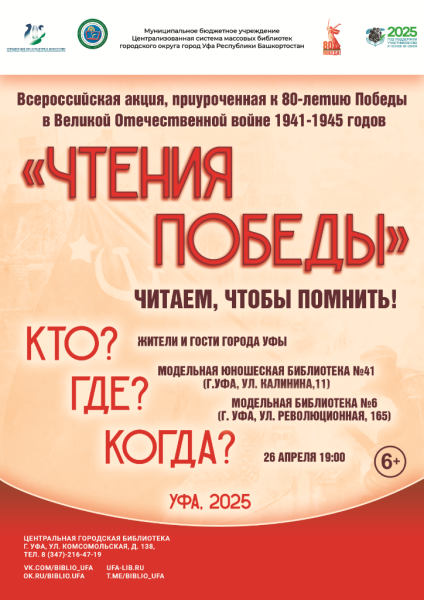 В преддверии великого праздника Дня Победы Централизованная система массовых библиотек г. Уфы организует патриотическую акцию «Чтения Победы», направленную на сохранение исторической памяти о подвиге советского народа в годы Великой Отечественной войны.