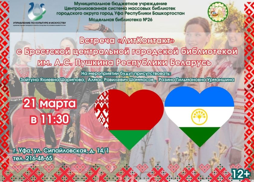 21 марта в 11:30 Модельная библиотека № 26 проводит онлайн–встречу «ЛитКонтакт» с Брестской центральной городской библиотекой им. А.С. Пушкина Республики Беларусь. Цель встречи – общее знакомство с литературной деятельностью писателей регионов.