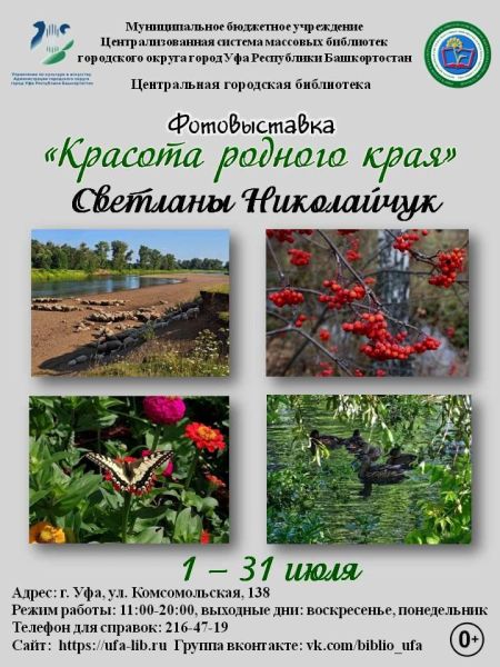 Фотовыставка «Красота родного края», посвящена 90-летию со дня образования Иглинского района. Будучи коренной жительницей села Иглино Светлана Александровна не могла остаться в стороне от такого значимого события в истории родного края. Она хочет поделиться со зрителями красотой её малой родины, которую необходимо беречь и сохранять.