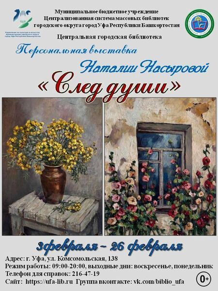 Дорогие гости и жители столицы! Центральная городская библиотека приглашает вас посетить персональную выставку картин уфимской художницы Наталии Насыровой «След души».