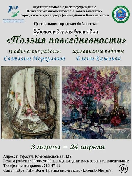 На выставке представлены графические работы Светланы Меркуловой и живописные работы Елены Кашиной. В экспозицию вошли работы разных лет, выполненные в технике масляной живописи и в смешанной графической технике. Авторы обращаются в своем творчестве к простым, обыденным сюжетам: натюрморт, портреты обычных людей, пейзаж из окна, цветы на подоконнике... Окружающий мир повседневной жизни, улицы, по которым ходишь каждый день, люди, деревья за окном мастерской и бытовые предметы - все это отражает жизнь художника, наполняет ее и таит в себе красоту и поэзию. Передать эту поэзию, как импульс повседневной жизни, может только искусство.