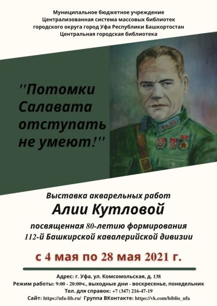 Выставка посвящена 76-й годовщине Победы в Великой Отечественной войне 1941-1945 годов, присвоению звания Героя Российской Федерации генерал-майору Минигали Мингазовичу Шаймуратову и предстоящему 80-летию формирования 112-й Башкирской кавалерийской дивизии.