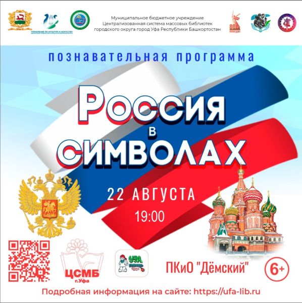 22 августа массовые библиотеки г. Уфы приглашают на познавательную программу «Россия в символах», приуроченную к празднованию Дня государственного флага Российской Федерации в рамках Дней армейской культуры в Республике Башкортостан в парк культуры и отдыха «Дёмский».