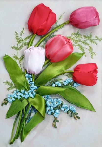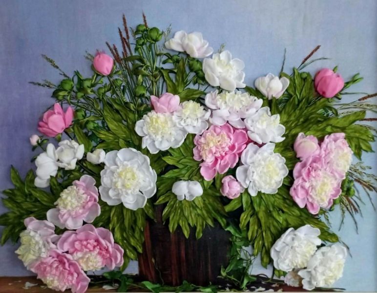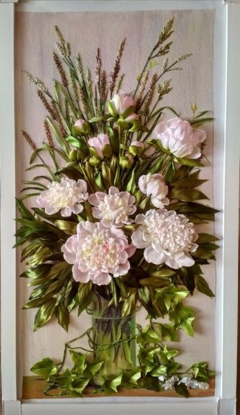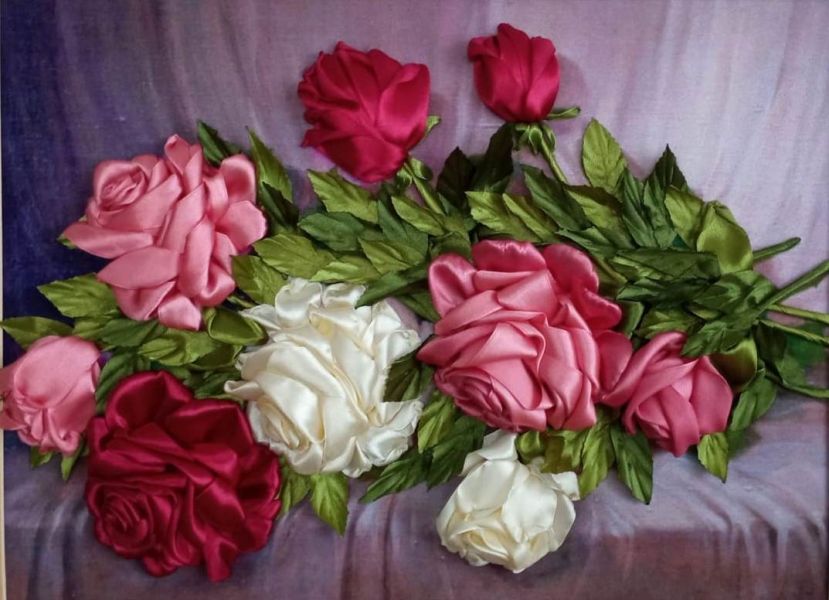 Увидев однажды в интернете картины с цветами вышитыми атласными лентами, её это очень заинтересовало и захотелось тоже попробовать вышить свои любимые цветы. Как это происходит, представления не имела, как можно из ленты 5 см прошить через ткань и получить цветок. Мысли не давали покоя. И вот однажды нашла объявление о мастер-классе, который проходит в Уфе. Было это в январе 2014 года. Тут же позвонила, записалась, оплатила и поехала учиться. Мастер-класс был однодневный, но этого хватило, для того чтобы иметь представление, как это происходит.