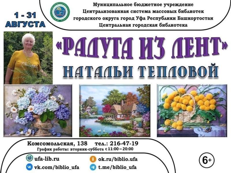 4 июля впервые в выставочном зале Центральной городской библиотеки города Уфы открылась персональная выставка рукодельницы Натальи Тепловой. Свою очередную выставку, которая будет проходить в завершение лета, Наталья решила назвать "Радуга из лент" и посвятить её красоте природы нашего родного башкирского края. Объёмные, живые картины, выполненные в технике вышивки лентами, завораживают своим великолепием. Подобные работы традиционно называют "живыми картинами".