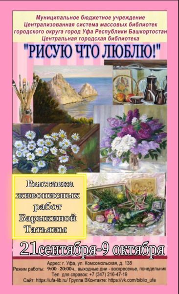 21 сентября 2021 г. в выставочном зале Центральной городской библиотеке г. Уфы открылась персональная выставка талантливой уфимской художницы Татьяны Барыкиной «Рисую что люблю!».
