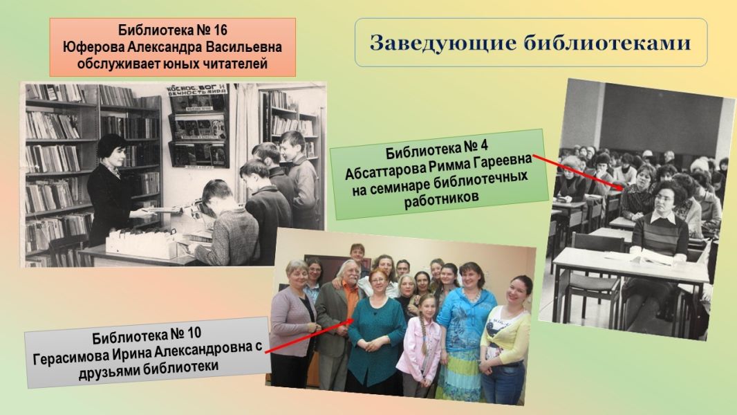 После Герасимовой И.А. заведовала библиотекой Мухамадиева Елена Тимуровна, в настоящее время заведующая модельной библиотекой № 10 Исанбаева Елена Фаизовна.