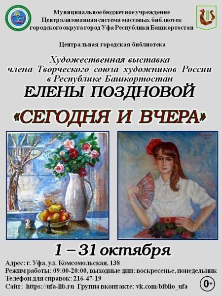 1 октября в выставочном зале Центральной городской библиотеке г. Уфы открылась художественная выставка «Сегодня и вчера» члена Региональной общественной организации, Творческого союза художников России в Республике Башкортостан, члена Союза писателей России, живописца, графика, поэта и писателя - Елены Поздновой.