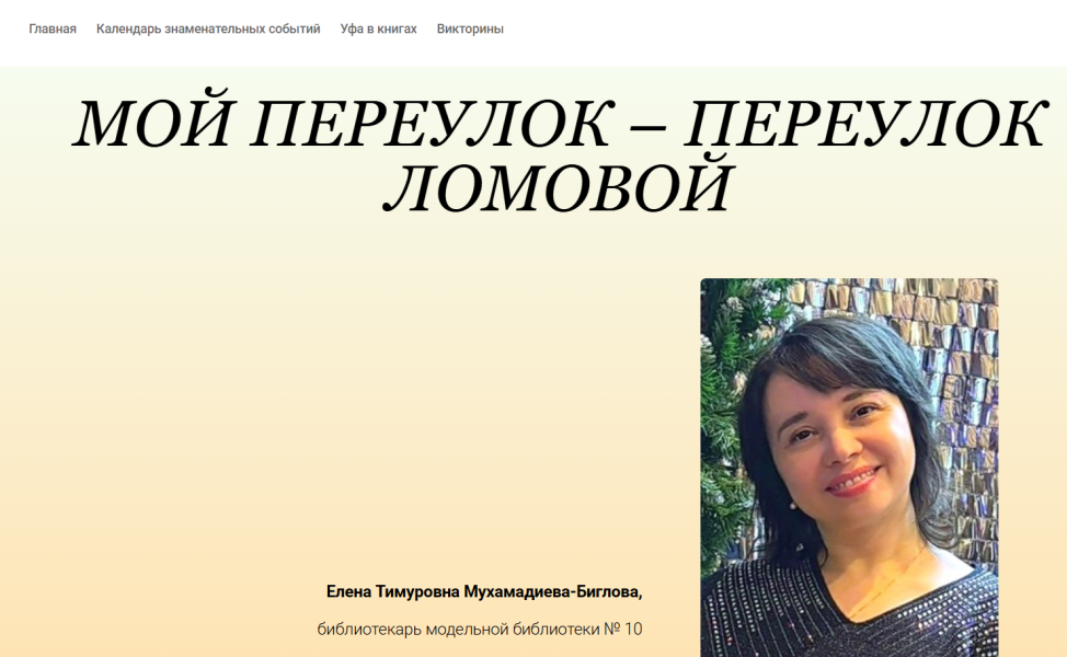 Первый рассказ о любви к малой родине «Мой переулок – переулок Ломовой» предоставила нам Елена Тимуровна Мухамадиева-Биглова, библиотекарь модельной библиотеки № 10 МБУ ЦСМБ ГО г. Уфа РБ.