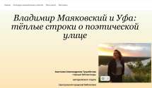 Главный библиотекарь методического отдела Центральной городской библиотеки Анастасия Александровна Тукумбетова очень красиво написала о своей улице Маяковского, которая расположена в Черниковке. «Владимир Маяковский и Уфа: теплые строки о поэтической улице» - https://mozz.ufa-lib.ru/владимир-маяковский-и-уфа-тёплые-стро/