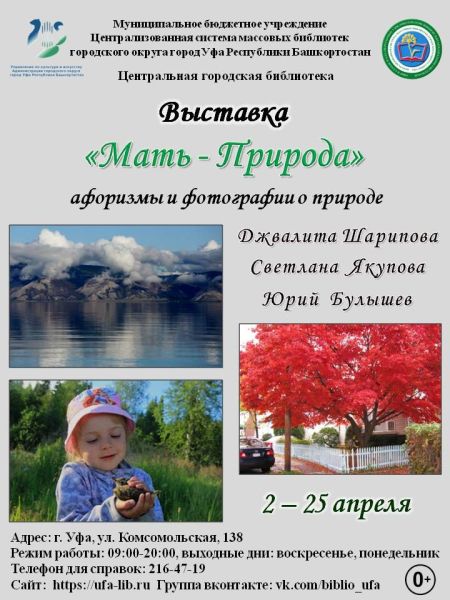 Напоминаем, что в Центральной городской библиотеке проходит фотовыставка живописных мест Урала и Сибири «Мать – Природа». Фотографии выполнены Челябинской путешественницей и фотографом Светланой Якуповой, уфимкой Джвалитой Шариповой и известным иркутским фотохудожником Юрием Булышевым.