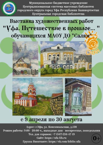 9 апреля в Центральной городской библиотеке города Уфы открылась выставка художественных работ обучающихся объединения «Арлекин» МАОУ ДО «Салям» (педагог Захарова Татьяна Алексеевна) «Уфа. Путешествие в прошлое», посвященная 450-летию со дня основания города Уфы.