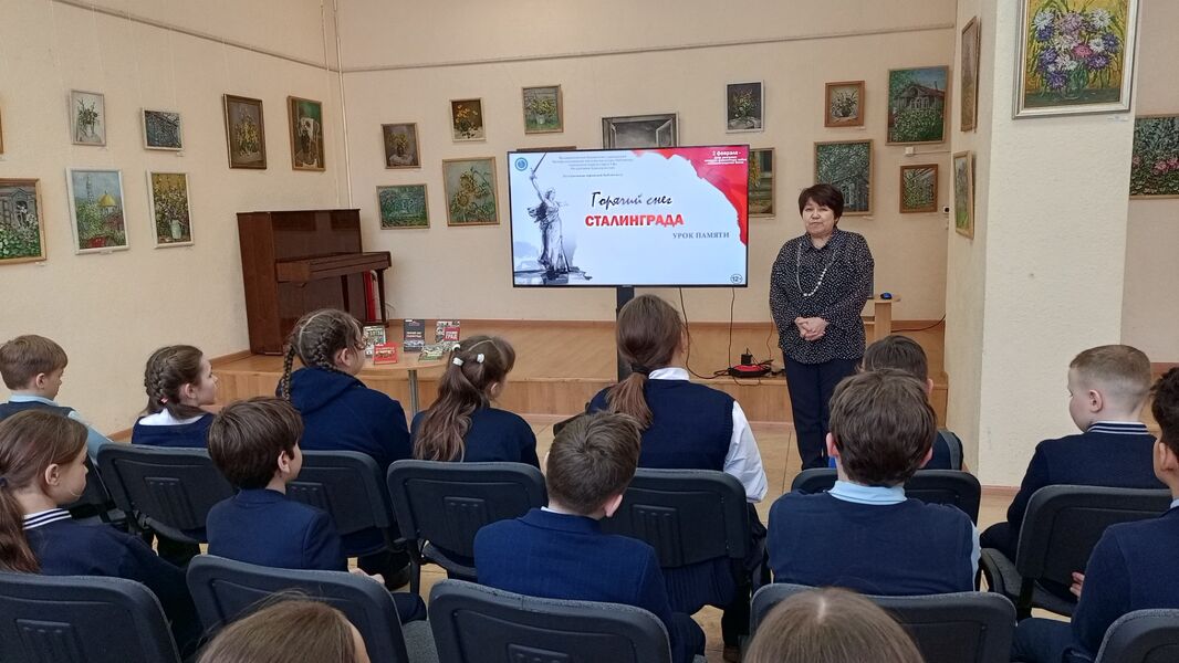 Библиотекарь рассказала школьникам о том, как в годы Великой Отечественной войны солдаты стойко защищали Сталинград (ныне Волгоград) от фашистских захватчиков. Ребята также узнали об обороне «Дома Павлова», ставшего важным опорным пунктом, при котором наши солдаты, оказавшиеся в окружении, геройски отражали многочисленные яростные атаки врага и удерживали дом, а также о подвиге снайпера Василия Зайцева, уничтожившего 225 солдат и офицеров противника.