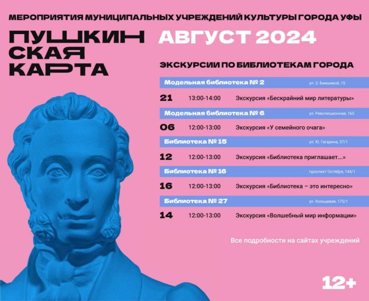 Уфимцы и гости города от 14 до 22 лет!Приглашаем Вас на интересные экскурсии в массовые библиотеки Уфы в августе!Добро пожаловать!
