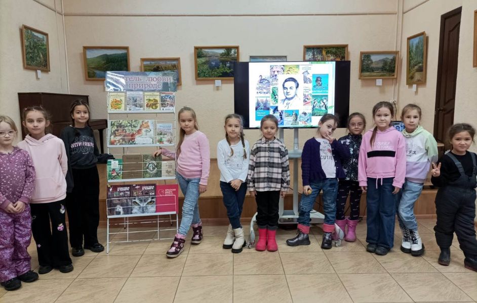 Заведующая залом отраслевой литературы и периодических изданий Наталья Калачева познакомила ребят с биографией и творчеством писателя-фотоохотника.