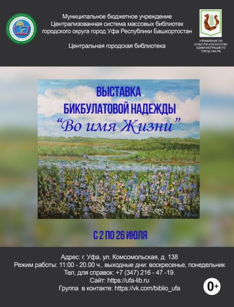 2 июля в выставочном зале Центральной городской библиотеки города Уфы открылась художественная выставка «Во имя жизни» профессионального художника Надежды Бикбулатовой.