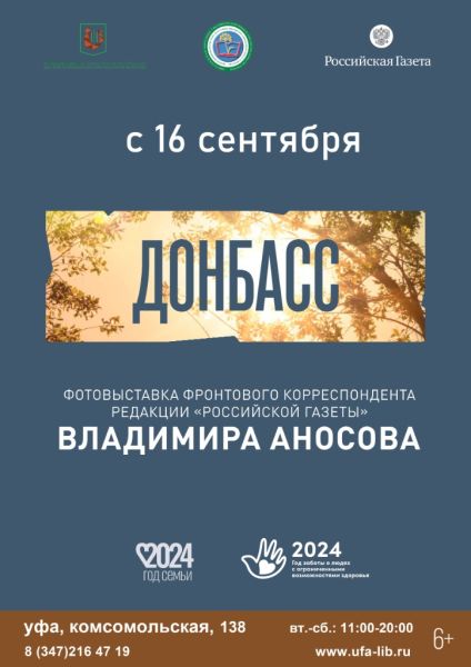 16 сентября в Центральной городской библиотеке г. Уфы открылась выставка «Донбасс». В новой экспозиции представлены 20 снимков фронтового корреспондента «Российской газеты» Владимира Аносова, сделанных в зоне СВО: на передовой, а также в Мариуполе, Донецке, Лисичанске, Волновахе, Луганске и других уже российских городах.