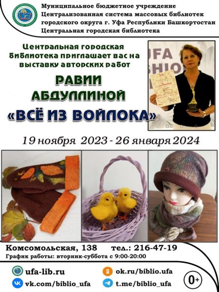 19 декабря в зале отраслевой литературы Центральной городской библиотеки г. Уфы открылась выставка творческих работ «Все из войлока». В экспозиции представлены авторские работы Равии Абдуллиной.