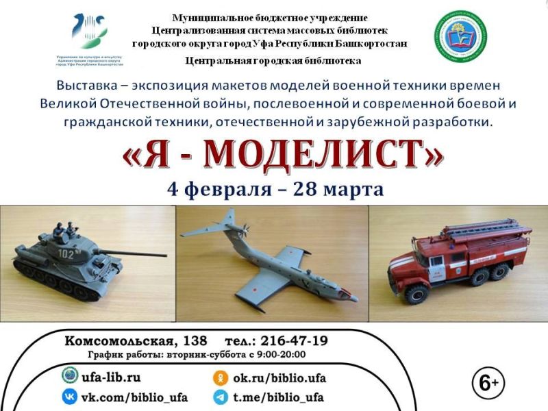 4 февраля в зале отраслевой литературы Центральной городской библиотеки города Уфы открылась ежегодная выставка – экспозиция макетов уфимских моделистов. В экспозиции представлены несколько десятков различных моделей отечественной и зарубежной военной и гражданской техники.