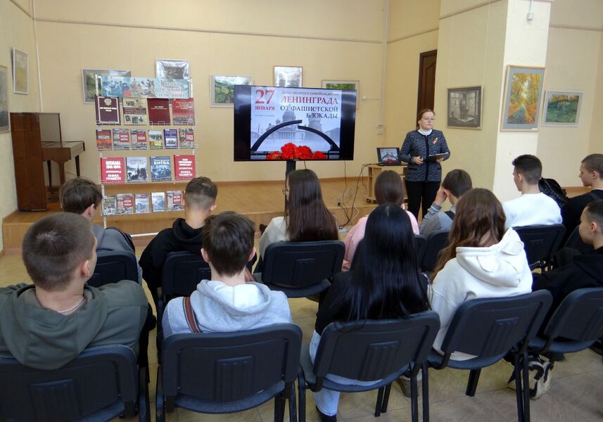 Центральная городская библиотека провела вечер-реквием «Ленинград. Блокада. Подвиг». Ведущая рассказала о тяжёлых испытаниях, выпавших на долю жителей осаждённого города, о детях и женщинах, работающих наравне с мужчинами на заводах, о защите и обороне Ленинграда советскими солдатами. Участники мероприятия посмотрели документальные фильмы о ледовой «Дороге жизни» и военную хронику «Блокада Ленинграда».